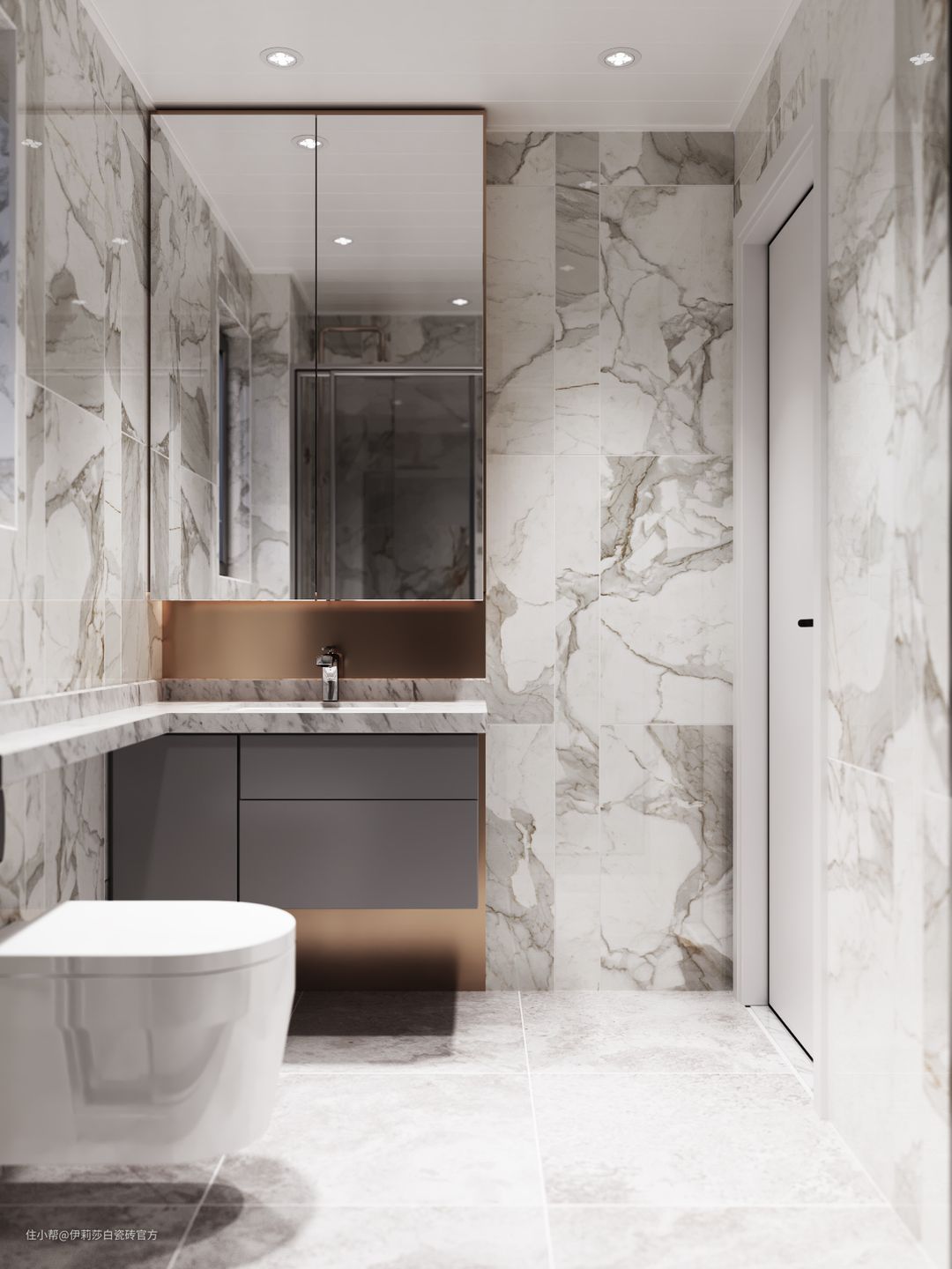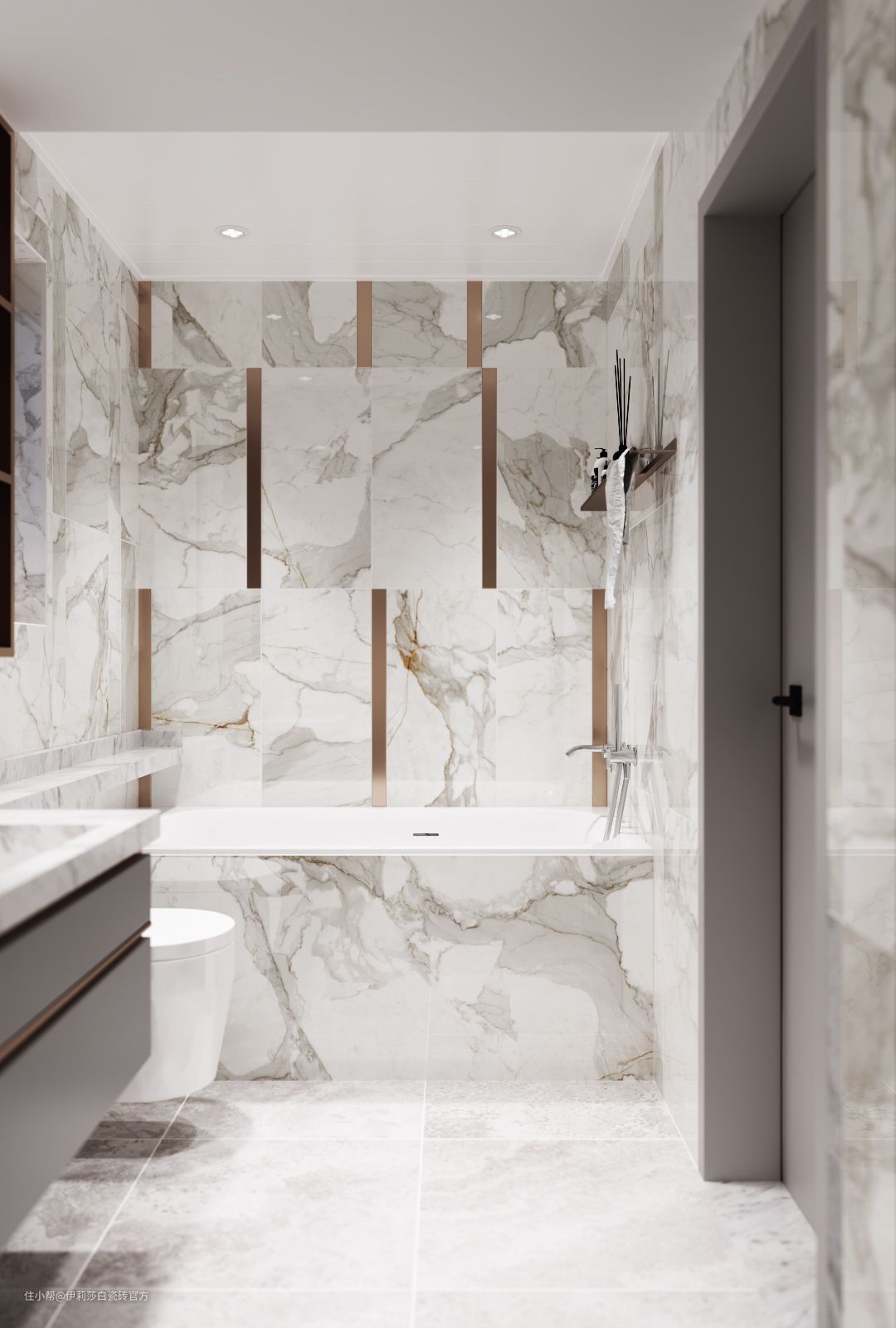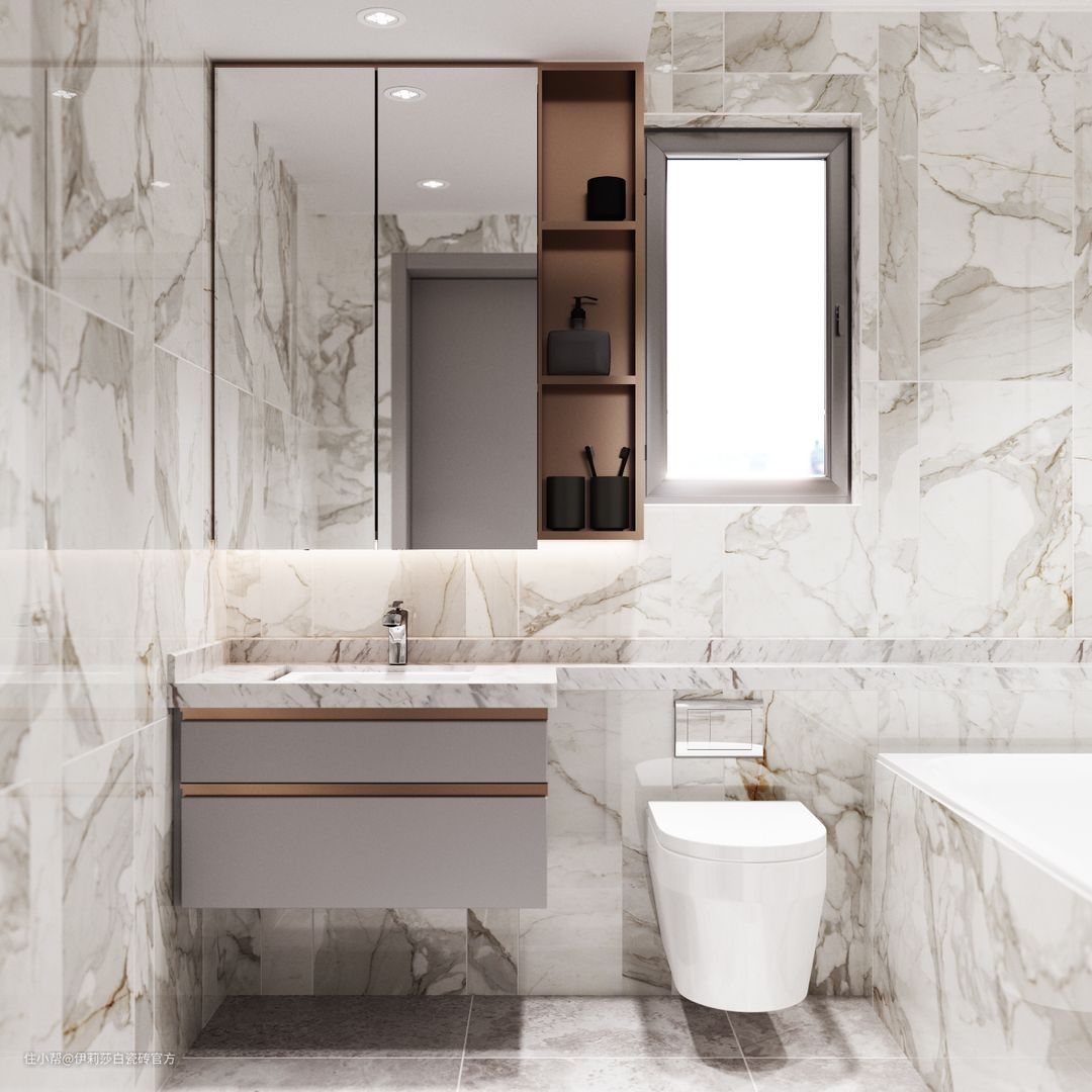 卫生间空间,同样也打造出轻奢小资的情调。“鱼肚金”百变切割,加以金属线条衬托,雅奢氛围蔓延开来。“鱼肚金”丰富粗犷的灰色纹理游走于砖面,缕缕金丝镶嵌其中,极具艺术美感。