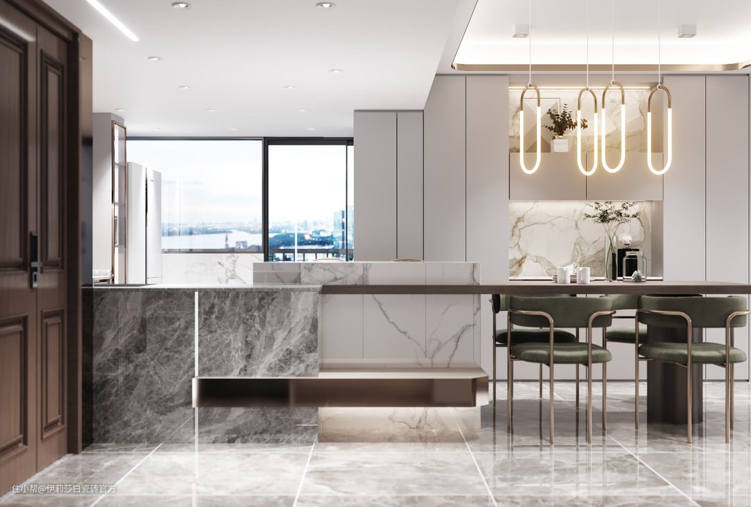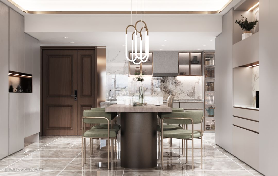 除了卧室,卫生间以外,公共区域地面通铺伊莉莎白“古堡灰”大理石瓷砖,高级又质感十足,同时也彰显了业主高品质品味。“古堡灰”中灰基调中融入了暖黄晕染,在灯光的照射下更显柔和温馨;金属元素灯饰与家具,大理石餐台与“古堡灰”地砖,两者间的相互搭配,感官上整体和谐又统一。