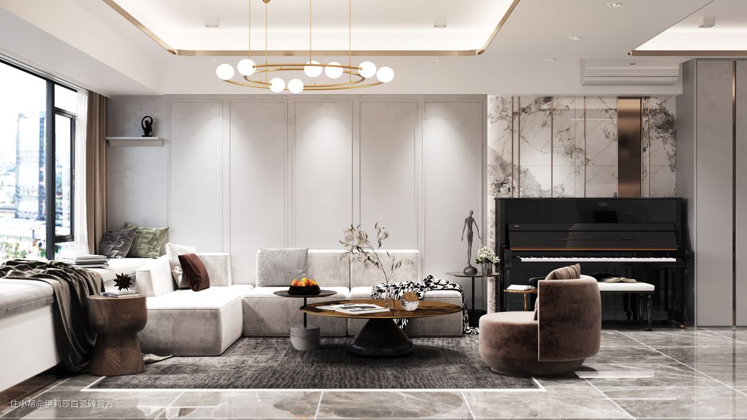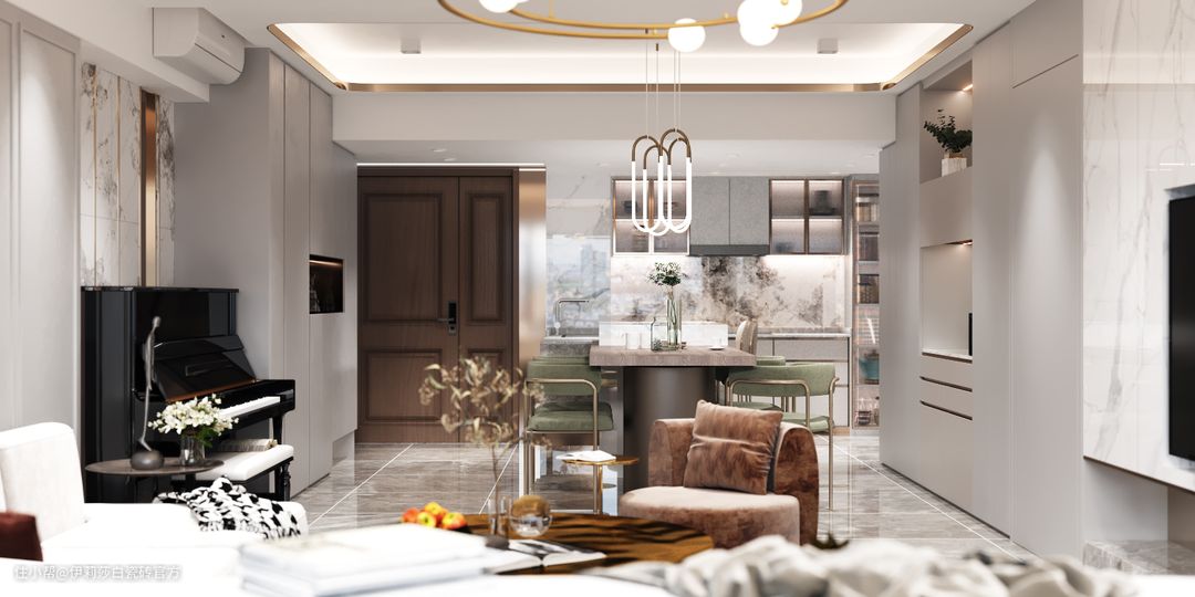 业主希望能腾出一个区域摆放钢琴,便于孩子日常练习,设计师在考虑了整体的空间的布局后,便决定在边柜与沙发之间设置一个练习区,摆放钢琴。钢琴区的墙面设计师也是用了小心思的。“白云舒展,云貂浮现”,云貂是一款极具艺术性的连纹大板,为了让音乐区看起来有格调,设计师把“云貂”大板一开三,两片拼接间用精致的金属线条装饰,打造了一面独特的艺术背景墙,在这里陶冶情操,音乐细胞也能被大胆释放。