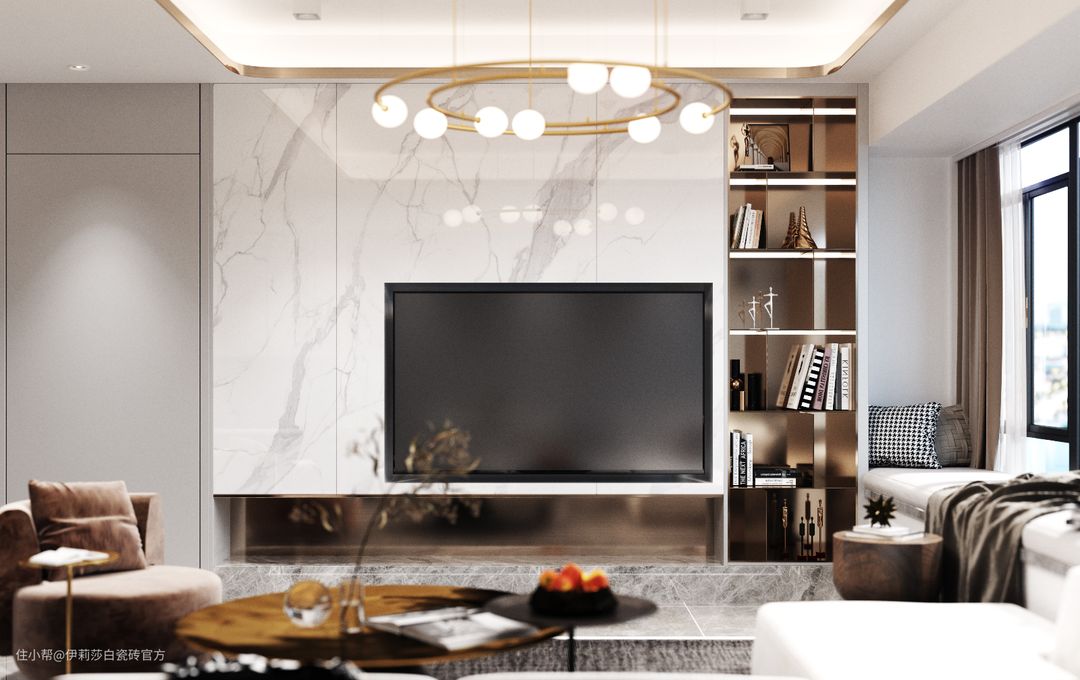 电视柜地台选用中灰系“帕斯灰”,与地砖“古堡灰”有着明显的色差,两种大理石瓷砖搭配,强化了空间质感的同时提升了时尚气息。
