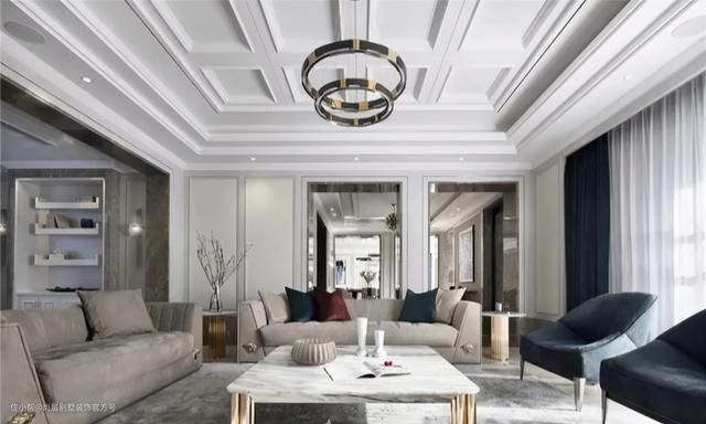 利用井字梁以形利导,或是为了顶面的造型所制作假格梁的一种吊顶形式,可以变相隐藏不可敲除的横梁。井格式吊顶造型复杂独特,因其合理的结合了房子本身的结构,让布局变得更加完美,让空间感变得更强。