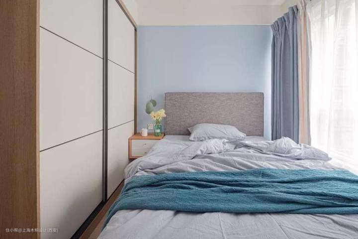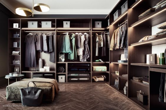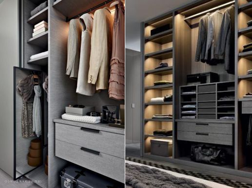 主卧衣柜主要承担了衣物和被褥的收纳,一个一米的衣柜大约可以收纳10~15件衣物和5~10双鞋子,所以主卧的衣柜会在合理范围内做大,部分家庭会有衣帽间的设计。