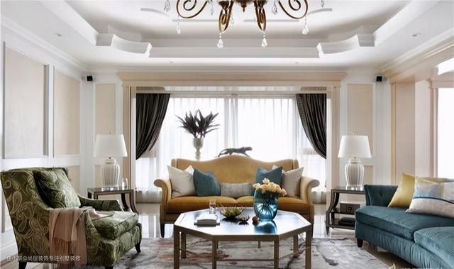 别墅客厅作为体量较大的空间,往往通过艺术品的搭配做为点睛之笔。西式风格通常搭配瓷器、小雕塑、绘画等作为装饰;中式风格则多选用屏风、字画、匾额等强调气氛;另外,客厅还可以增设书籍、烛台、收藏品等来提高生活的艺术品质。