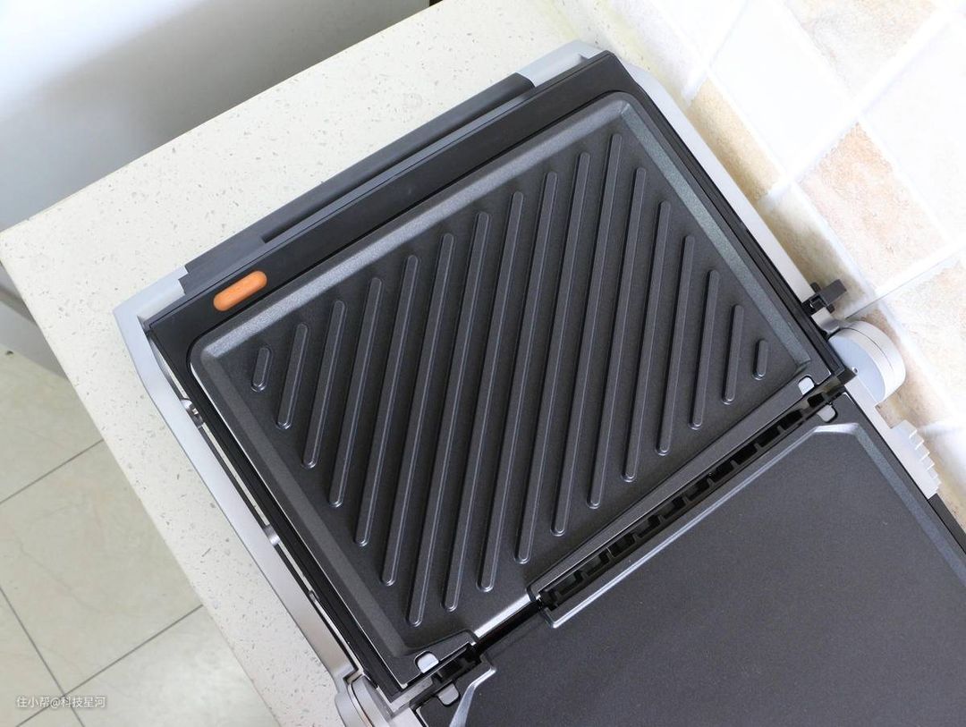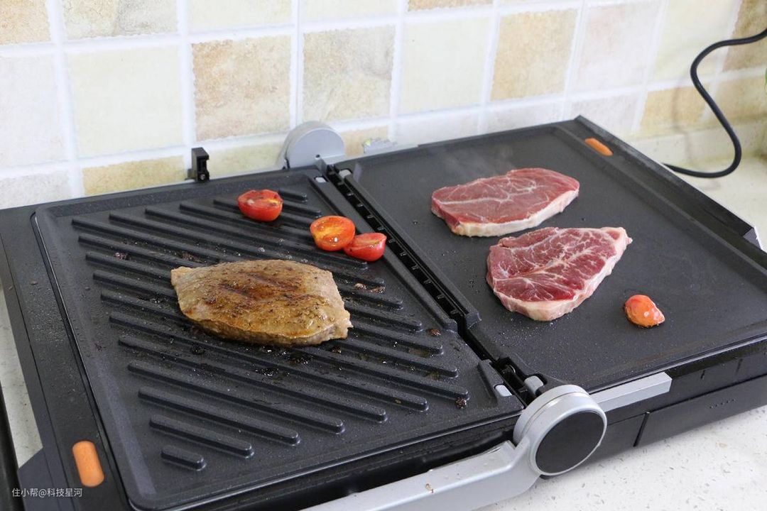 现在我有了膳美师牛排机,其180°开放式设计,两面都可以煎烤,一面直条烤盘、一面平面煎盘。