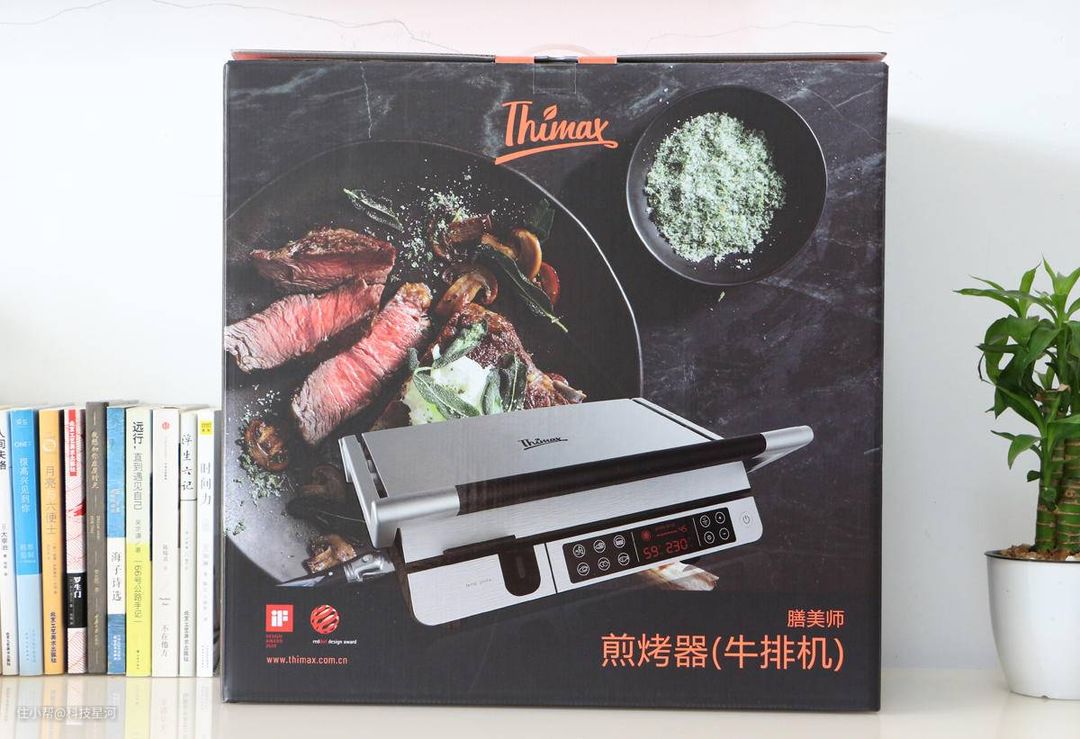 Thimax膳美师牛排机的外包装上彩色印刷了牛排机的外观图形。