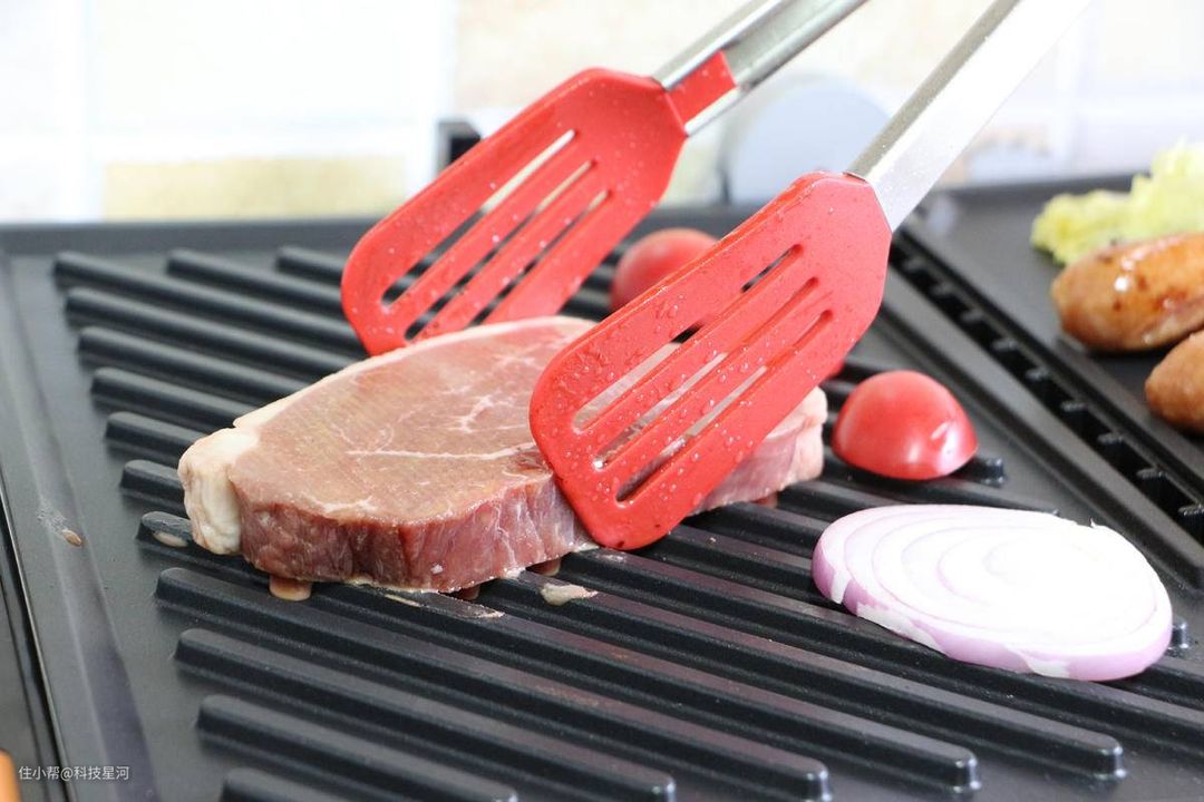 实际煎牛排过程中,需要使用硅胶食品夹,不能翻转厚厚的牛排。