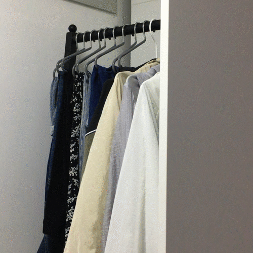 家属身高169cm,可以顺利拿取衣架顶部的裤挂。身材娇小的小姐姐,衣裤长度占空间也小,把挂衣杆调整到适合自己的高度,顶部空档部分加搁板做收纳。