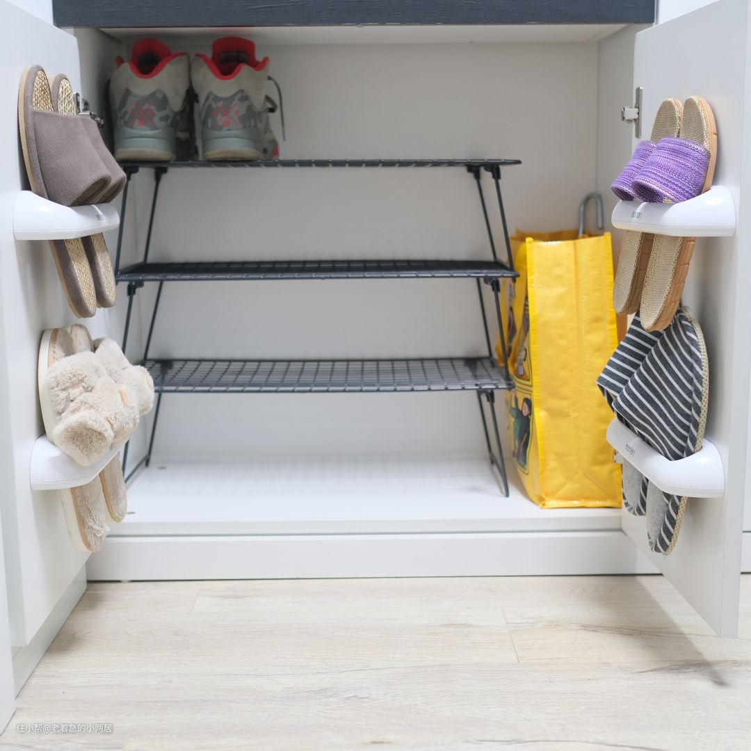 1.鞋柜立体收纳:多放8双拖鞋,4顶帽子,6个包。