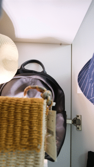 【包包帽子】柜门可以挂多个扁挎包/环保提兜,兼顾挂帽子。柜内定了三块深度24厘米的隔板,放家属的包包刚刚好。