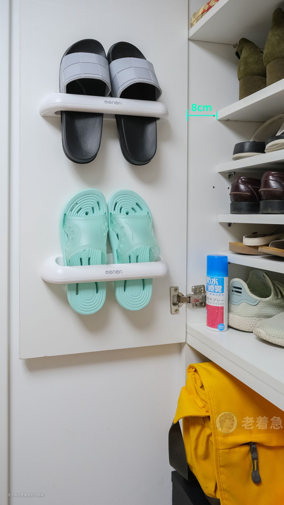 🏷️【压榨空间】把最短的女夏鞋全都整理出来,配合26cm短隔板(柜深34cm),隔板空间后退的8厘米安置壁挂拖鞋。8双拖鞋停车位凭空出现了!!!
