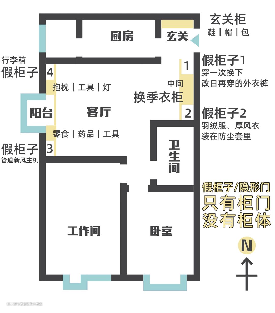 老着急的客厅有六扇隐形门,4个假柜子mini储物间。