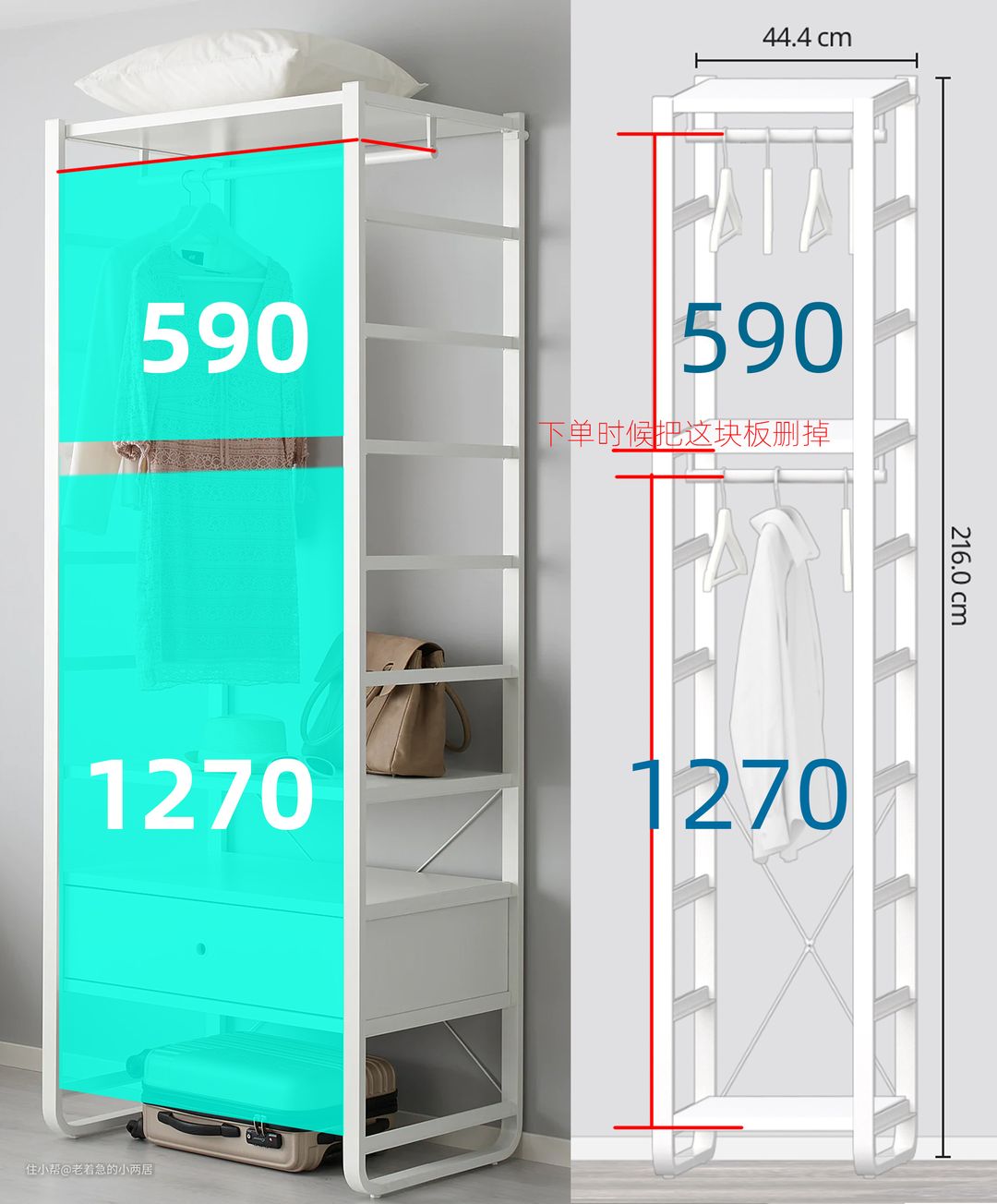 【避坑】下图要从购物车中删掉的搁板,是宜家设计软件必须给的套餐带的,如上图,老着急家用不上,还要麻烦的退货。身材娇小的小姐姐把挂衣杆降低一格,正好把这块搁板用上了。