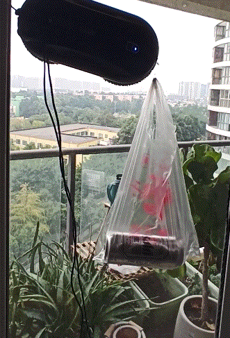 这里我们悬挂重物来测试擦窗机器人的安全性,一瓶500ML啤酒固定在工作的擦窗机器人上。可以看到擦窗机器人能够正常工作,并没有因为悬挂重物施加的重力发生偏离,擦窗机器人的安全性表现可见一斑。