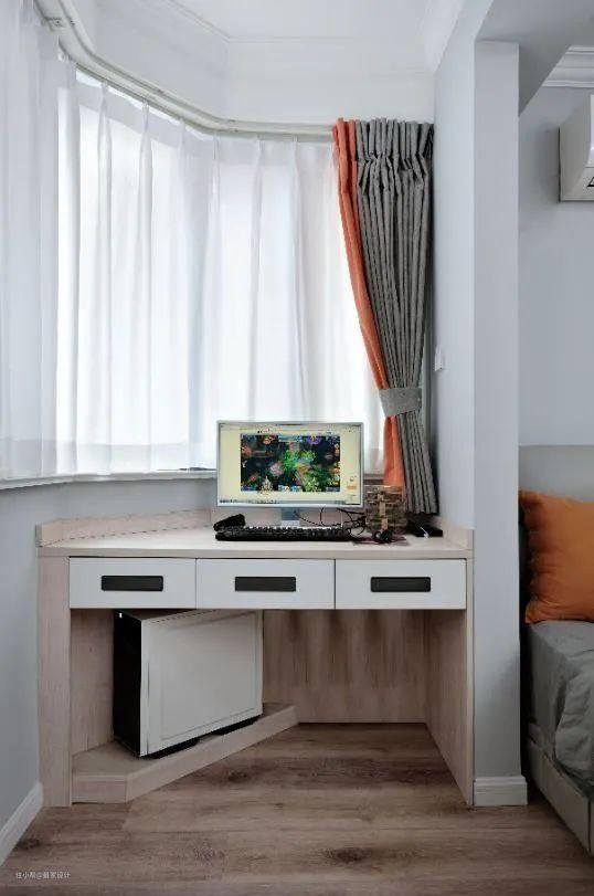 阳台两侧分别规划为工作区及收纳区,定制书桌完美贴合了不规则阳台。