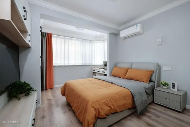 如今的主卧回归到了纯粹的居住功能,鸽子灰及橙黄的配色与客餐厅相呼应,明亮且温馨;床边的大衣柜为夫妻二人提供了日常收纳空间。