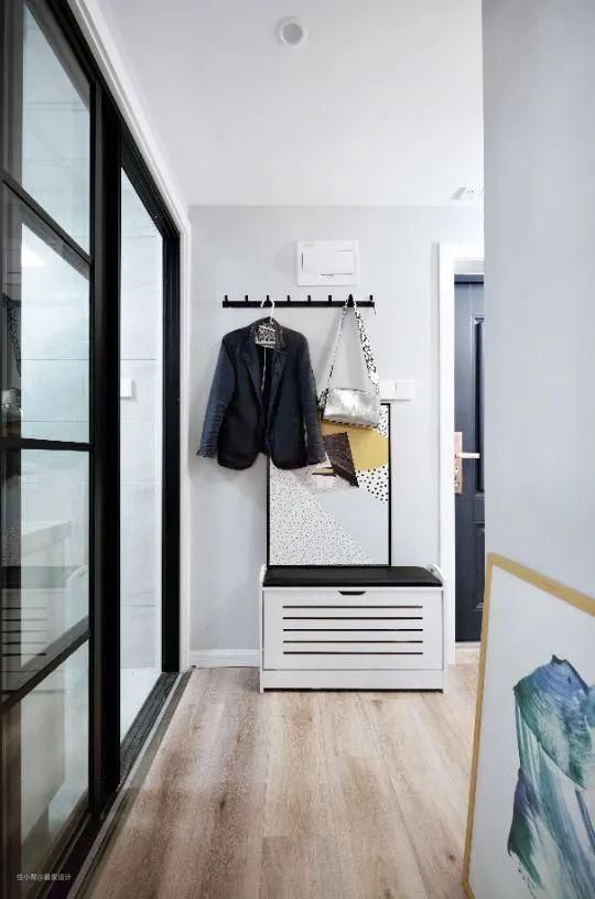 原来的门厅向右侧移动,考虑到孩子年纪还小,因此摆放了便于孩子坐着换鞋的鞋柜;随着孩子逐渐长大,平先生也可以自由更换鞋柜。