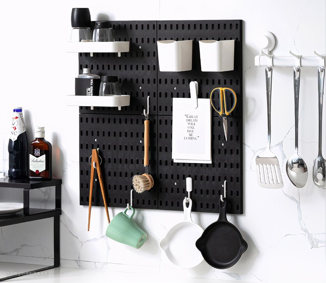 楼主买回来挂在厨房用,和书房用的宜家正版洞洞板没啥区别,用料扎实,外表防水,粘度很强。有黑、白两色可选,各种尺寸自由搭配,配件可直接一起拍下。