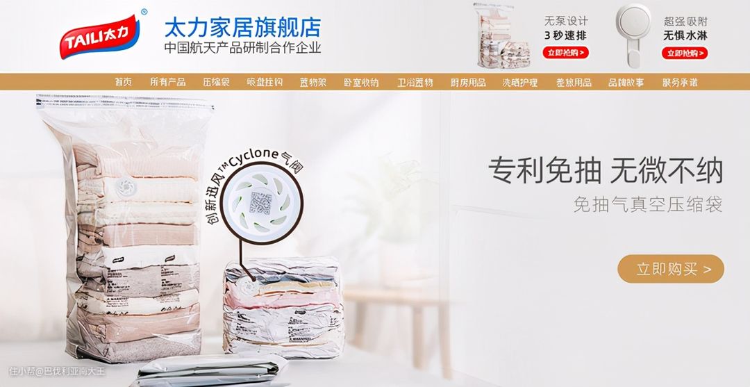 太力是一个专门研究真空收纳、真空吸盘密封的专业品牌,他家的真空压缩袋都有自己的专利气阀,仅需3秒就能完成一整袋子的衣物压缩,快速给力。楼主家里的真空压缩袋一直都买的这个牌子,结实耐用,品质信的过。