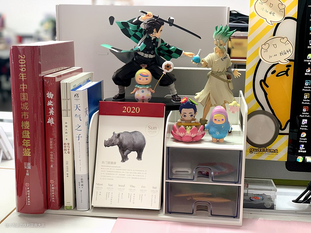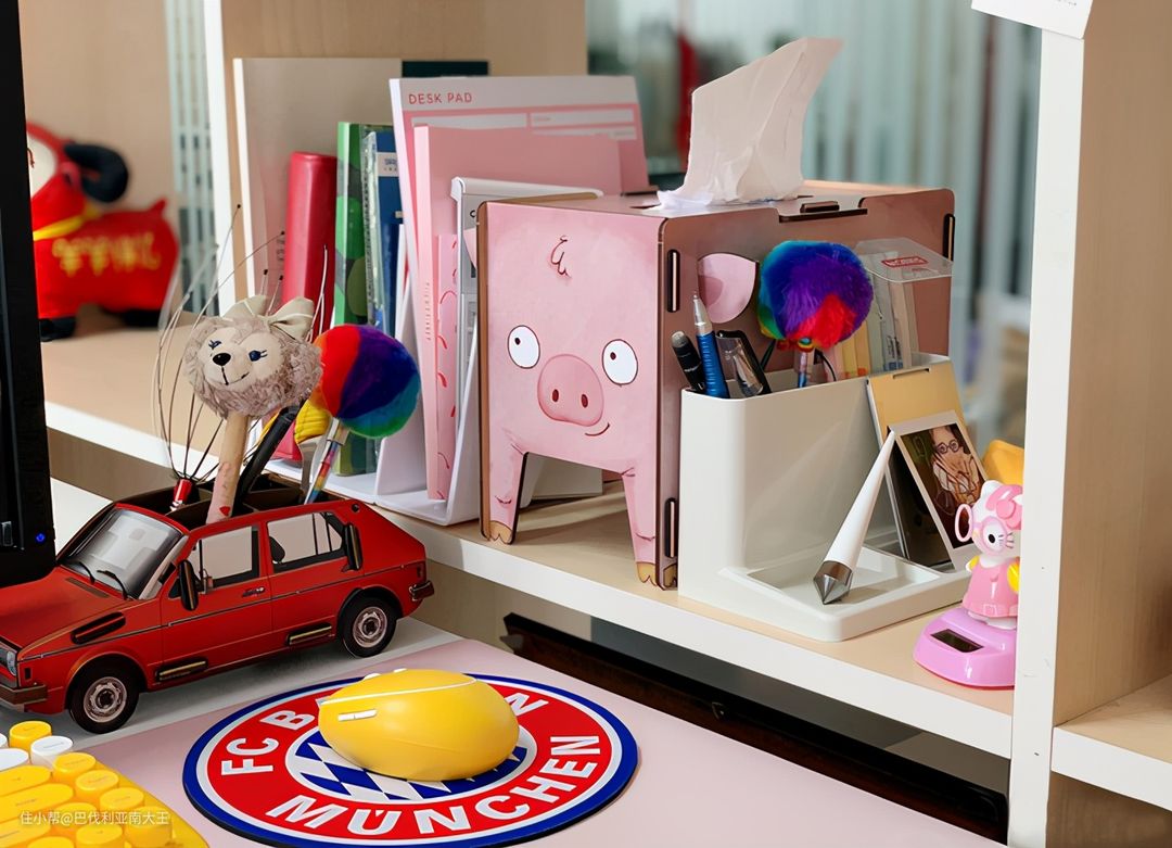 楼主的办公桌面右侧,由防滑书架、纸巾盒和多功能笔筒收纳盒组成。笔筒来自SYSMAX MYROOM,相对那些只能装笔的笔筒,这款前面的两个小托盘设计还可以放名片等,当个小物件收纳盒,整体风格简洁精致。