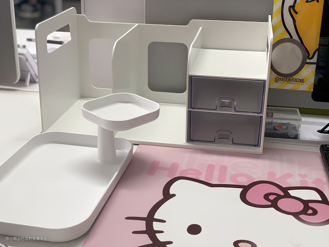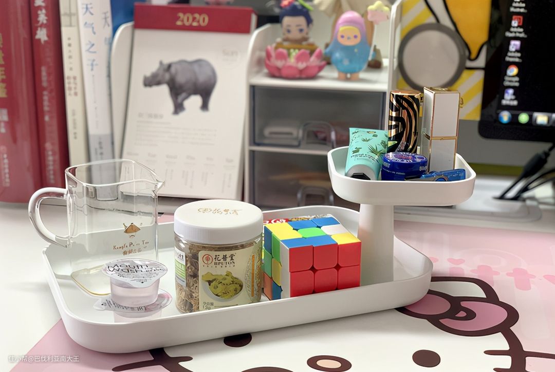 小托盘设计的也是简约实用,很多小物件都可轻松收纳。上面那个方形小托盘是可以360度旋转的,而且可拆卸,伸手拿取也方便。有白、灰、深灰三色可选,环保PC材质,科学的设计构造,很适合办公室使用。