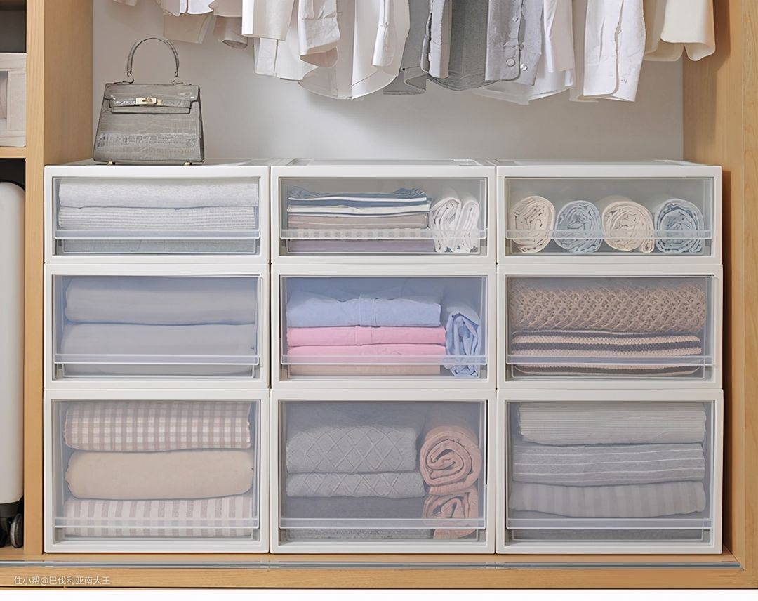 它家出的基本都是这种透明抽屉的收纳箱,寻找衣物更方便。尺寸丰富,既有能收纳厚重大件的,也有收纳内衣袜子这种小物件的,放在衣柜里都能严丝合缝,空间利用率飙升。面框是加固设计,不易变形承重强,另外底部可安装滑轮,放在客厅当个书柜,移动更方便。