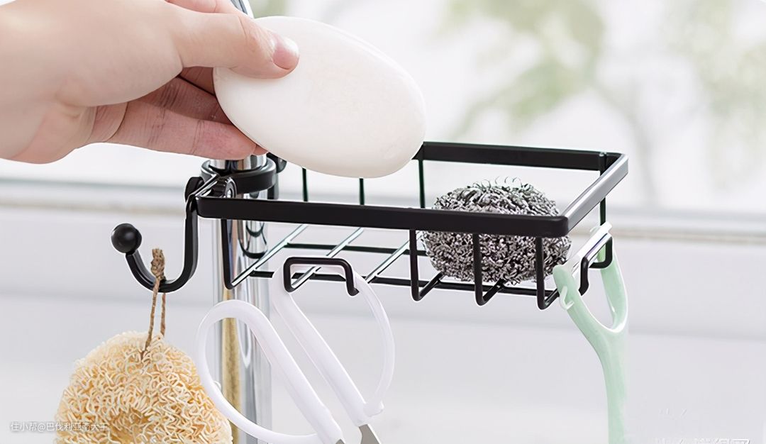 还有这个免打孔的沥水置物架,只要是圆柱形的水龙头都能固定住,加厚的铁艺材质结实又实用!主体边缘还有5个挂钩,可收纳一些厨用配件,卫生间的沐浴杆也可以用到它,省地方还美观大方。