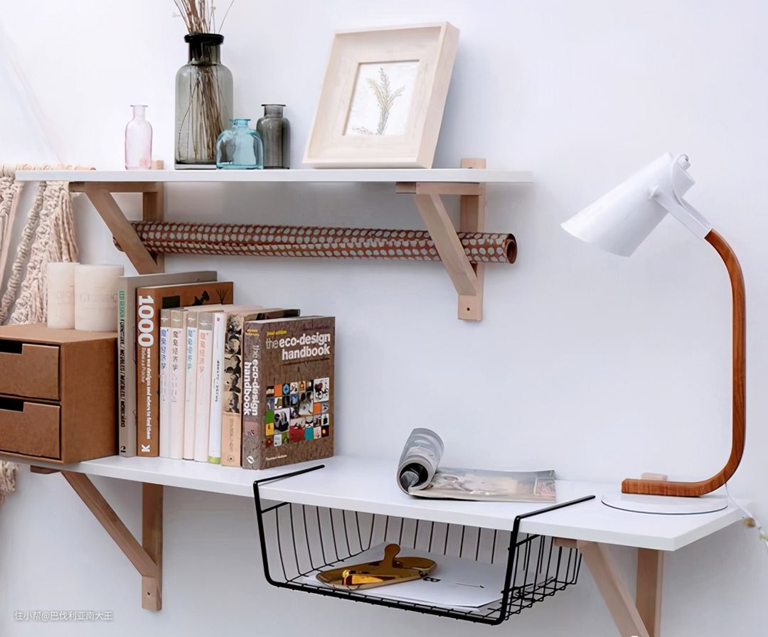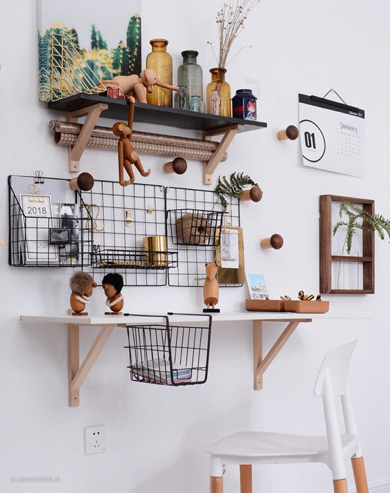这张图中所有的墙面收纳神器都来自这家店,既有能当桌子用的壁挂书桌,也有各种多用途的置物架,随意搭配,灵活性很高。