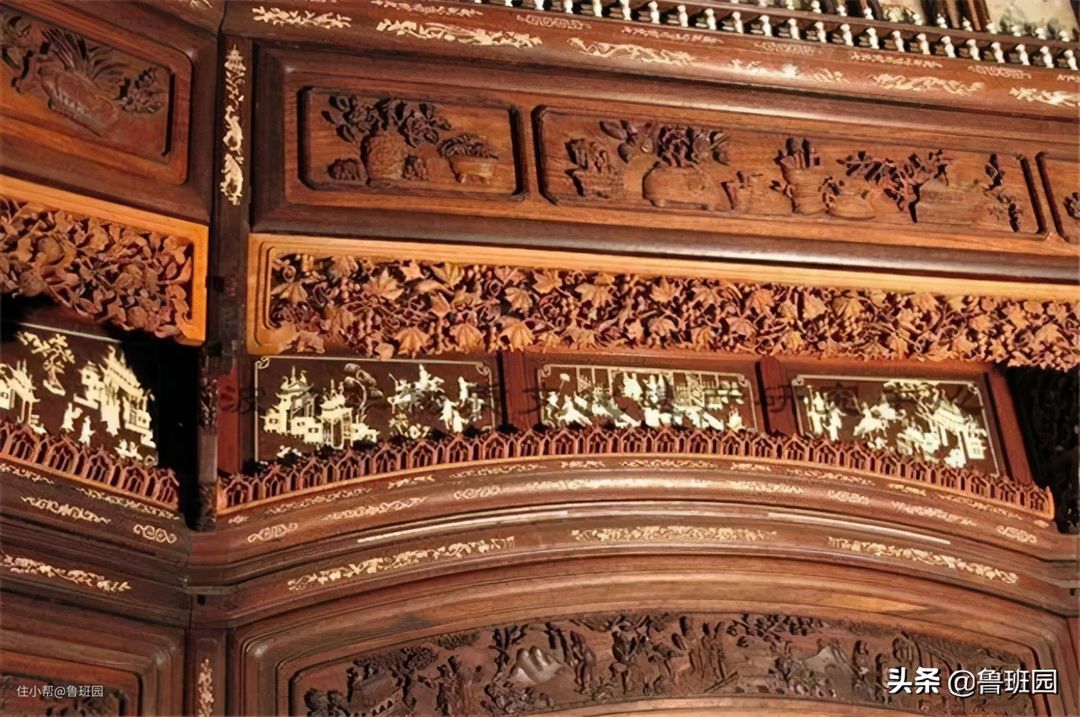 下图为宁波骨木镶嵌红木“万工床”,现藏于宁波紫林坊艺术馆。床通高2.9m,宽2.7m,深2.5m,以酸枝木、紫檀木为原料,以黄杨木、象牙、牛骨等为镶嵌材料。