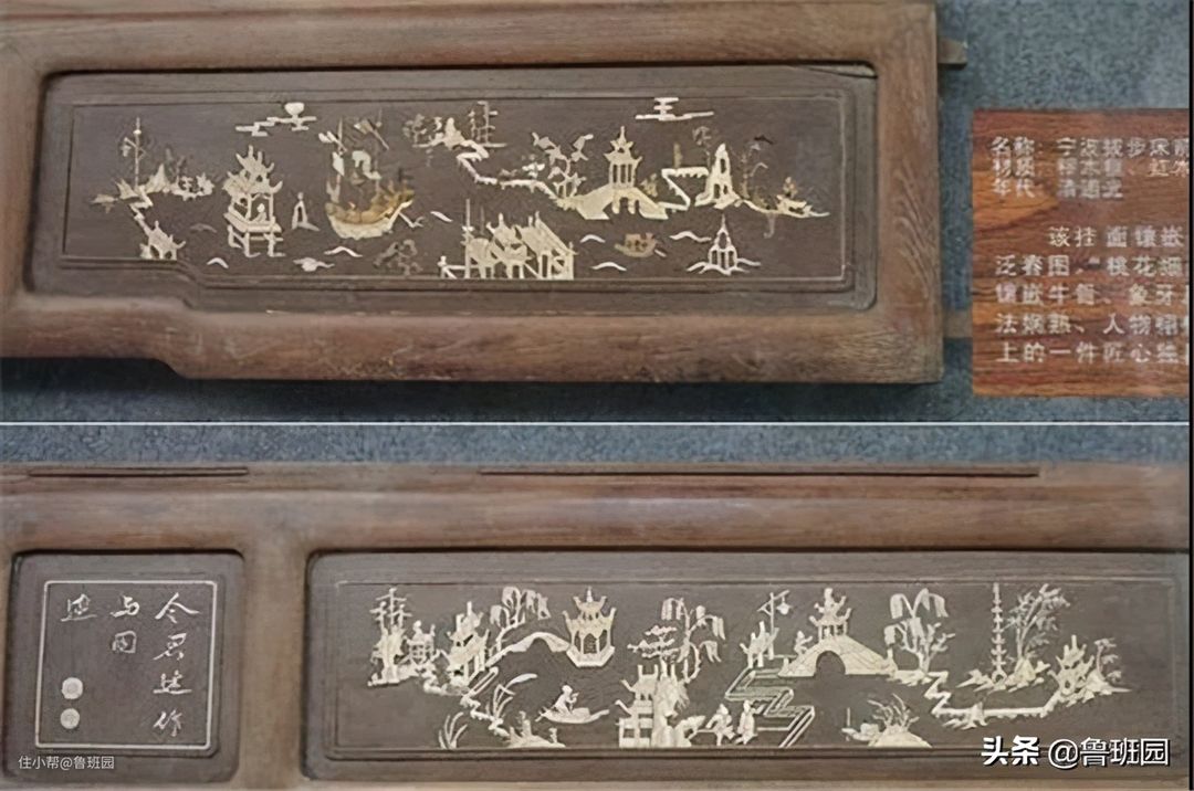 “万工床”包含95个吉子,7块黄杨木牙板,7块黄杨木花板,60块骨木镶嵌花板和18块双面雕刻的围屏,围屏正反面都是18块浅浮雕,24幅花卉图,12幅古代仕女图等。花板采用高嵌和平嵌,图案多为江南水乡的场景(如下图所示),亭台楼阁、小桥流水、树木和人物等形象生动,采用散点透视,疏密均匀、构图饱满,体现了当时的装饰画特色。