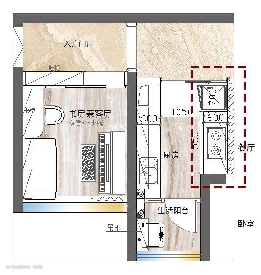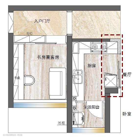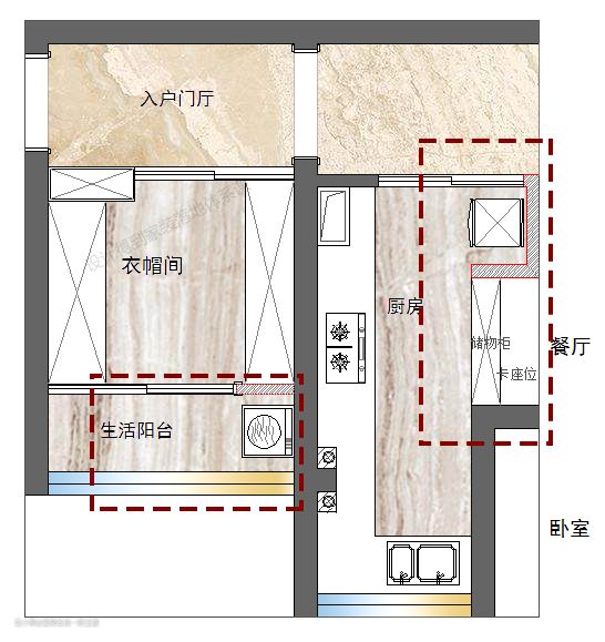 b、 放生活阳台大部分生活阳台基本挨着厨房和餐厅,如若厨房摆不下冰箱,可考虑将冰箱放置在生活阳台上,并没有很远,相反,厨房可以多做一些台面,增加利用率。如下户型中,原冰箱位置在烟囱红色线框处,本也没什么不妥,只是业主厨房实在想要多一点台面来烹饪,经过沟通后,将冰箱放到了阳台。从冰箱到洗菜盆,动线并没有很远。