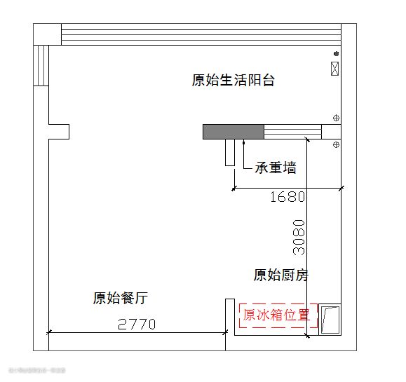 案例一:原始厨房过小,放置冰箱则厨房台面不够用。所以必须进行改造。