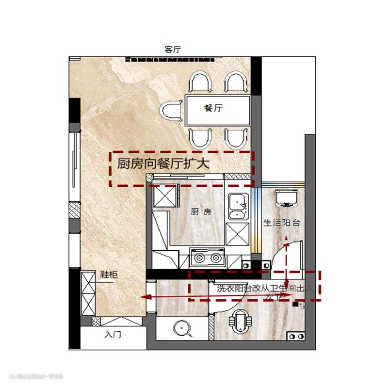 c、 放过道等空间放过道等空间一般做内嵌式以不出墙体为宜,可结合墙面造型或用屏风遮挡等方式进行设计。下图案例中是一个优化过的方案,厨房往餐厅区域外移,改善厨房过小的缺点。
