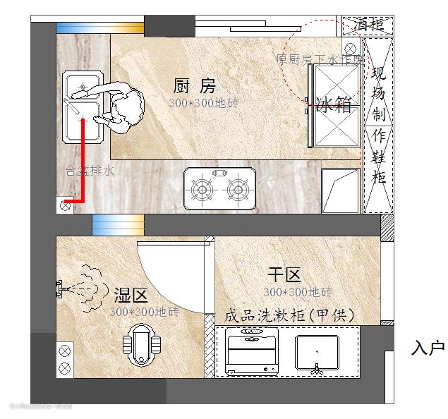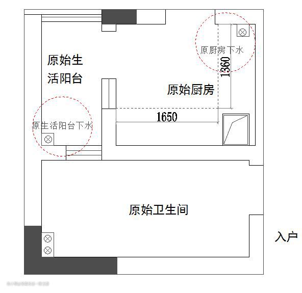 厨房下水管一般靠近窗户处,这样洗菜备菜的光线好。如遇厨房下水管背光,又改造了厨房的,台盆下水可利用靠近窗户的一根。如下图户型中,厨房和生活阳台比较紧凑,业主想要一个光线比较好的大厨房,且不想将冰箱放置到客餐厅,故只能将厨房扩大到生活阳台,厨房废弃原厨房下水,利用原生活阳台下水管下水。