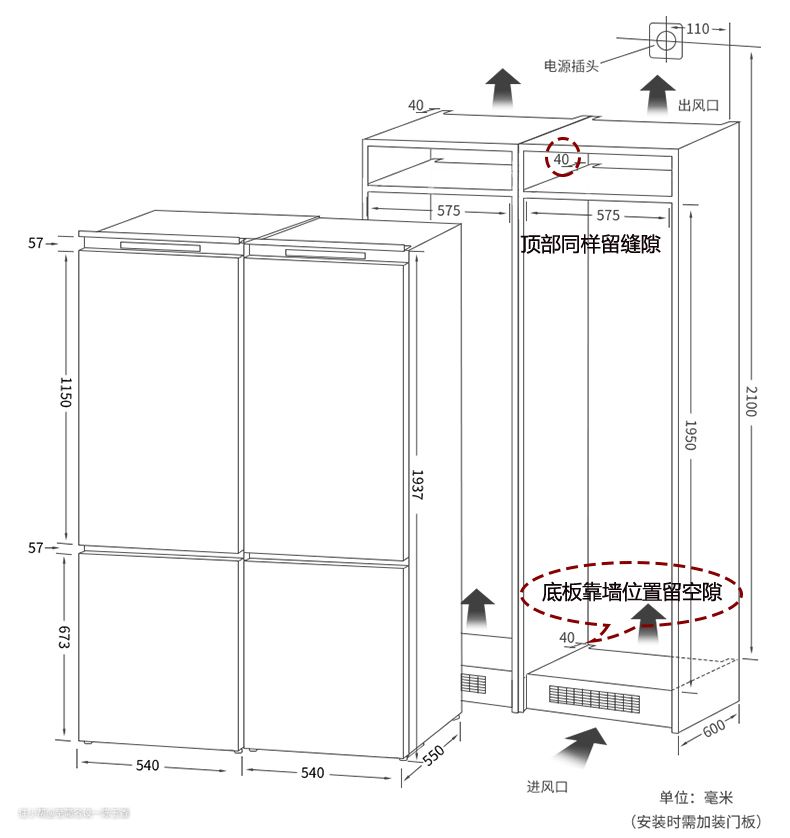 c、普通冰箱预留位置需要这么宽,有没有预留宽度更少更贴合的冰箱?答案是有的,市面上有一种冰箱柜体嵌入机,并不需要像普通冰箱一样左右各需预留约100㎜的距离,此种嵌入机采用底部散热的方式,左右两边可只要预留20㎜的距离,相比传统冰箱,左右可节省160㎜的空间,并且精致美观。