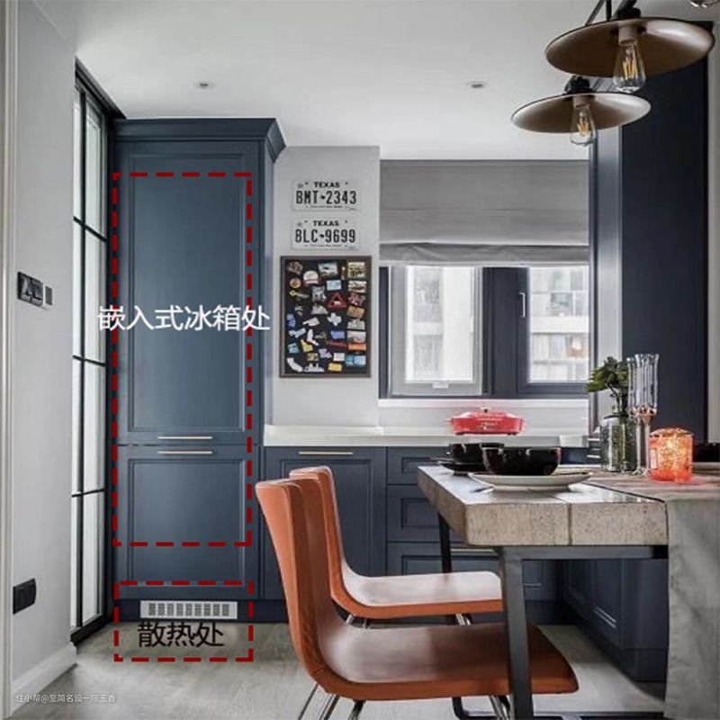 b、普通冰箱做嵌入式设计时需要注意什么呢?因为普通冰箱大都是外挂的散热方式,在后方和两侧散热,如果做嵌入式冰箱,考虑到散热及活动空间,建议冰箱左右及上方各预留100㎜的空间。如单门冰箱宽度预留在700㎜左右,双门考虑使用大双门的比较多,常会预留900㎜-1000㎜宽度,冰箱高度大约都在1800㎜以内,故嵌入式冰箱高度可预留1900㎜高度即可。如果厚度想跟橱柜等柜体持平,那么我们柜体要做到约700㎜厚度(双门)。