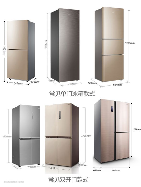a、常见冰箱都有什么尺寸?常见小单门尺寸560㎜宽×550㎜厚×1750㎜高(部分尺寸见下图)。