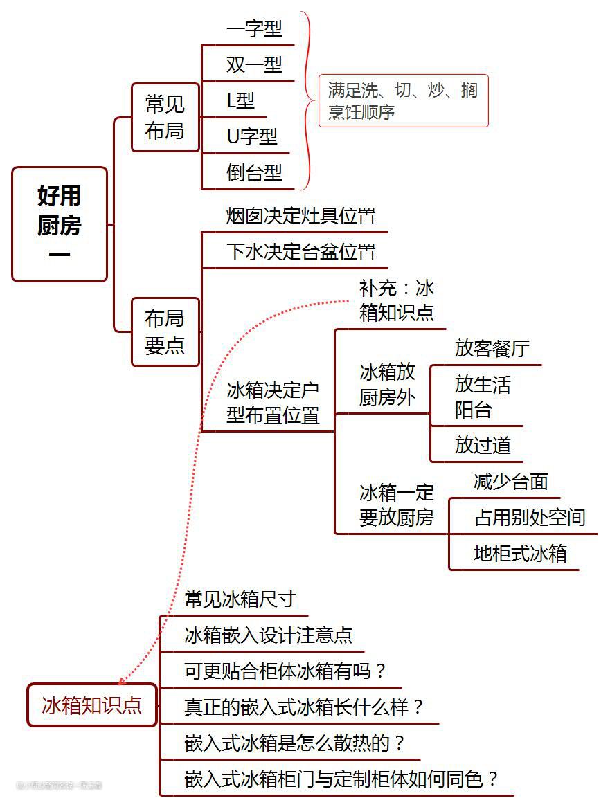 小结.1. 橱柜布局方式有很多,原始户型基本决定了布局方式,各种布局各有优缺点。满足洗、切、炒、搁的烹饪操作顺序即是王道。2.从三个角度给你介绍了好用厨房的三个布局要点,一是烟囱,二是下水管,三是冰箱位置。并顺带全方面普及了冰箱摆放的相关设计注意事项。布局要点介绍里配套了大量施工案例进行讲解,望你仔细思考琢磨。