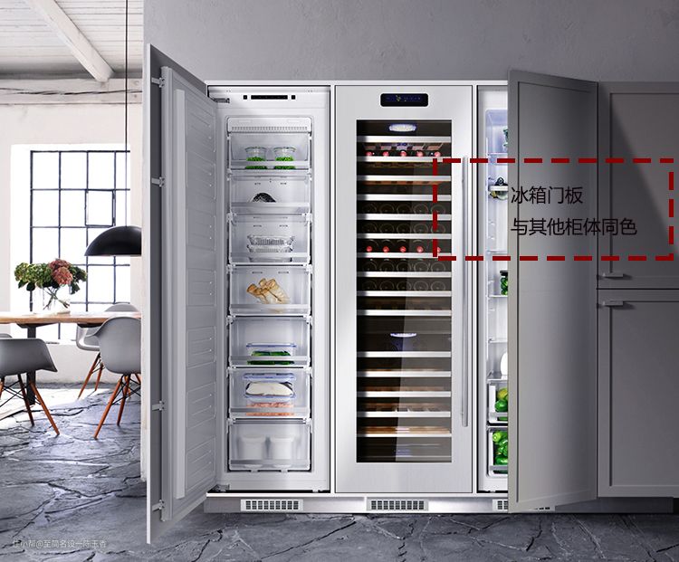 d、真正的嵌入式冰箱长什么样?以上介绍的冰箱皆是假嵌入式,目前有一种真正嵌入式的冰箱,冰箱面板可定制橱柜面板,关上柜门找不到冰箱系列。他们长如下这样。