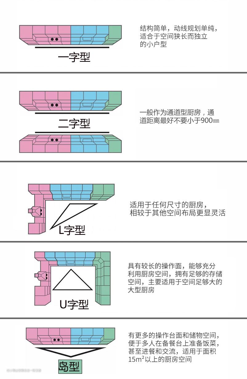 01.橱柜常见布局有哪些?说到橱柜的布局,无外乎网上常谈的那五种方式:一字型、二字型、L型、U型、岛型。原始布局开发商已经定好,至于哪种最好,并没有绝对的说法(操作台面越宽越好)。只要满足厨房操作动线就可以了。基于烹饪习惯及顺序,理想的操作顺序一定是这样:在冰箱处拿菜、洗菜区洗菜、备菜区切菜、烹饪区炒菜、顺手搁菜。即:‘洗、切、炒、搁’。下面我用一张图给大家展示各种厨房布局的优缺点。