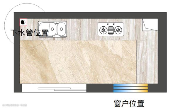 为避免厨房下水堵塞,厨房的台盆会靠近下水管,厨房下水管绝大部分是75㎜孔径的,部分厨房50㎜孔径。在遇到50㎜孔径的下水管时,尽量不要改动厨房的台盆位置,以免食物残渣堵塞下水管。