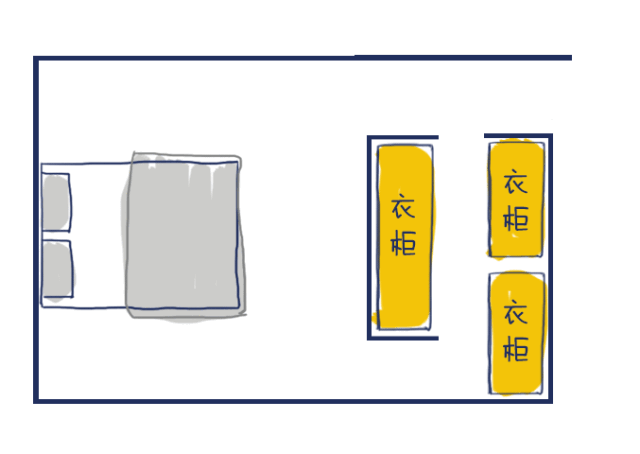 如果卧室不大,我们找到房间一角,利用“L形”布局和床头,拼出一个三角区域,卧室衣帽间就诞生了。