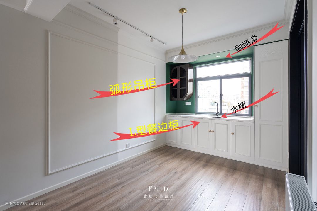 窗户另一侧打上带弧形边角的吊柜,精致小巧、拿放物品也一目了然。而背面刷上了一圈绿色墙漆,堪称画龙点睛之笔,层次感立马出来了,也迎合了整体复古北欧的设计理念。