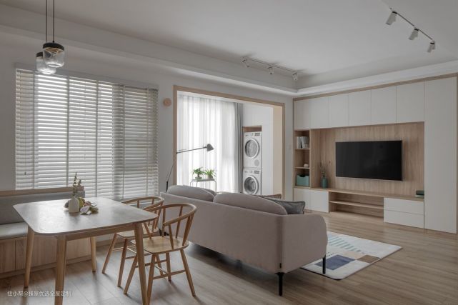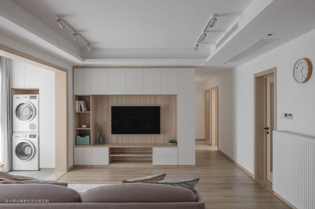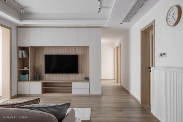 举个例子:一家小户型客厅,原本客厅净宽只有3000mm,电视墙很短连接了主卧和走廊。如果采用传统设计的电视柜(深450mm,高450mm),原本就狭小的空间就变的更小了。但这时采用在两侧增加薄薄的墙垛,再将电视柜镶嵌于墙体。这样做既不占用空间,还减轻柜子的体量带来的空间压迫感。