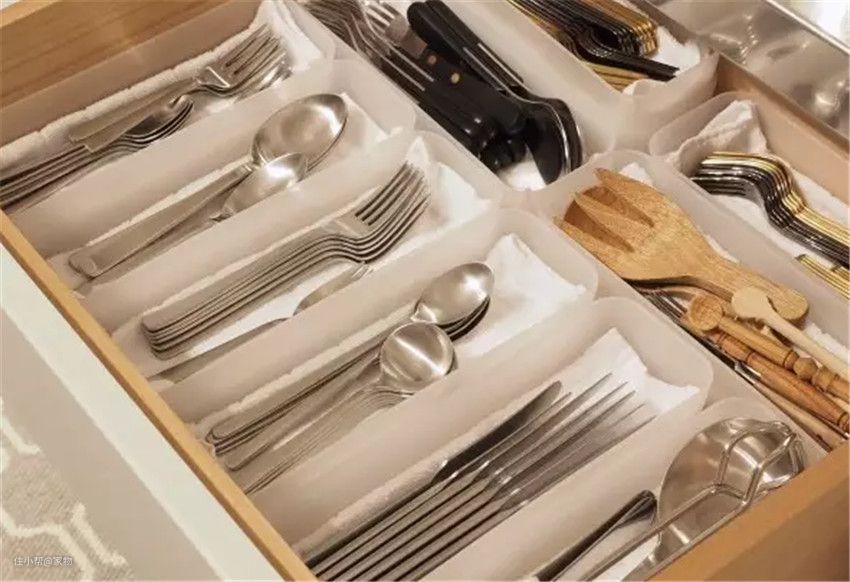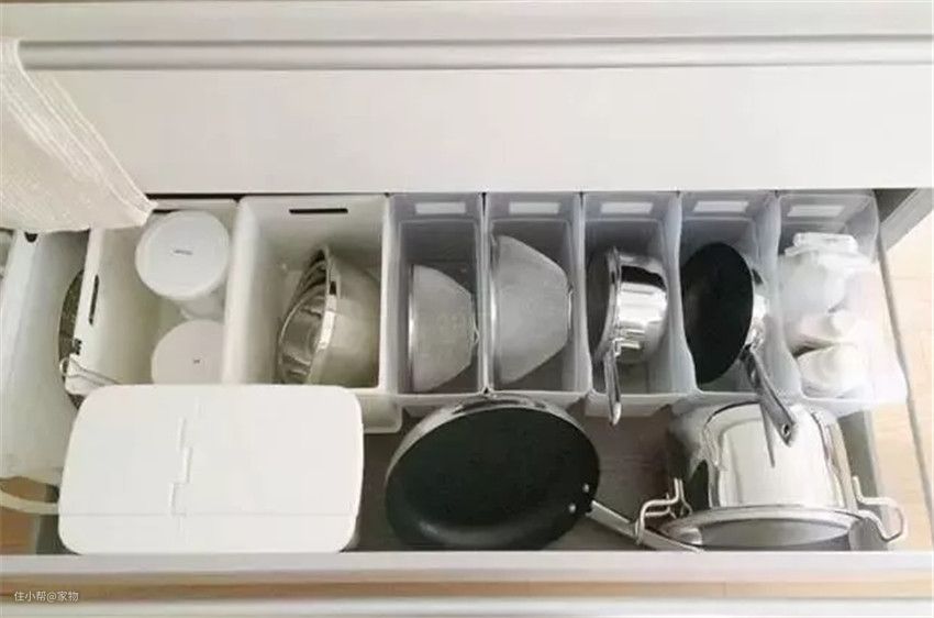 同理,锅碗瓢勺也能用文件盒进行收纳,将文件盒侧放在抽屉内,不占地还能保证各个厨具间的间距,以免碰撞和拿取的不便。
