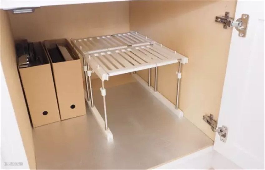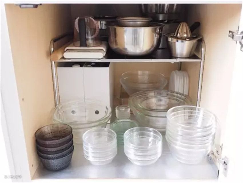 有了收纳盒,置物架也是少不了的。通常日本主妇会将置物架放在橱柜内,避免柜子进深太多导致储物不便捷;这样一来,置物架上下都能放置物品,储物空间大增;