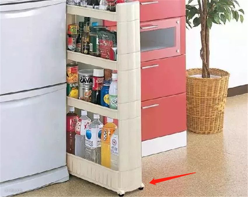 滚轮式整理架也很实用,占地小能储物,平时塞进角落或者缝隙里就行,滚轮的样式也方便清洁和整理,简直榨干厨房内的每一寸空间。