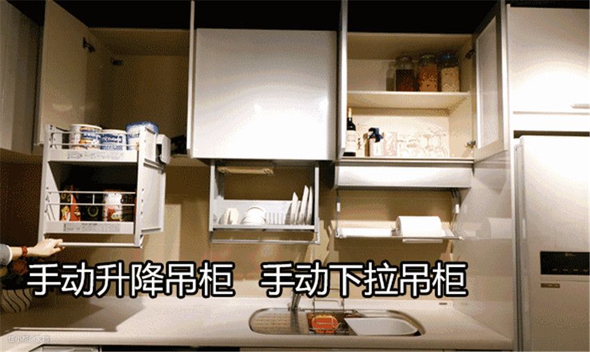 不同于我们国内的上翻式吊柜,日本大部分人家会选择升降式吊柜,即便是橱柜进深多且高,也只需轻轻一拉就能轻松拿到需要的物品;