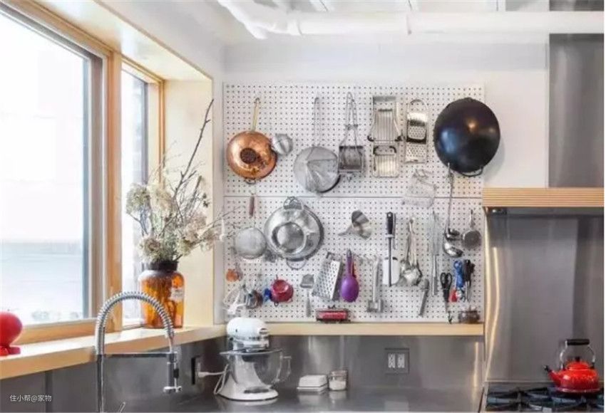 还很巧妙地利用洞洞板,上面的孔可悬挂勺子、铲子、砧板等,既节省空间,又易通风晾干。