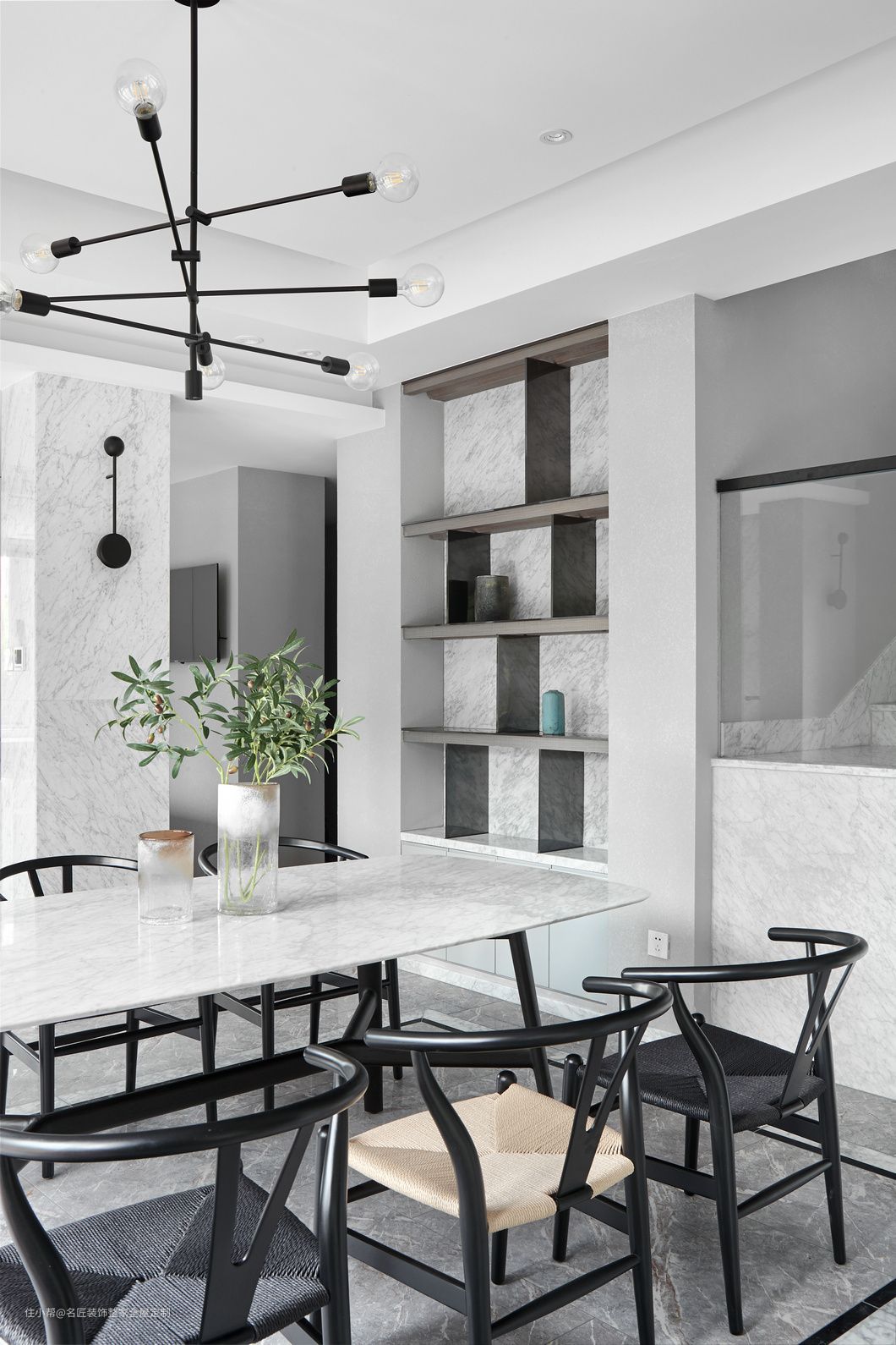 椅子的细节配色体现主人地位,桌台面用周边圆滑的大理石装饰,抛弃规则,不为杂念所左右,随心随性,向往自然。