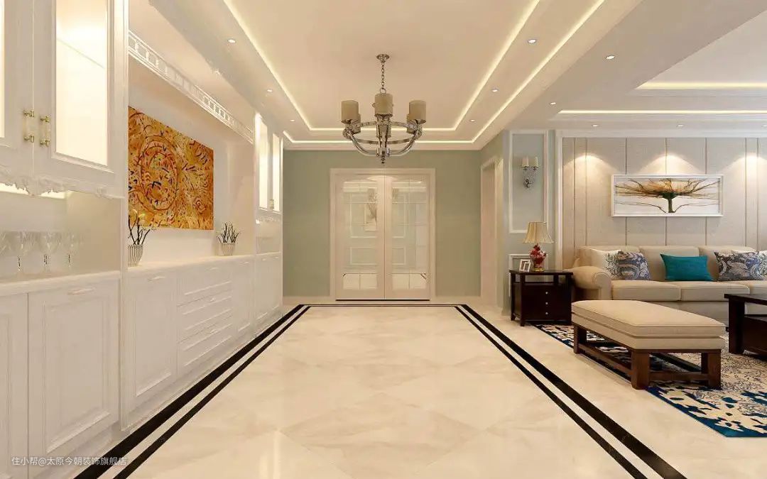 装修时选择铺贴波打线,简约明晰,与其他瓷砖的颜色形成鲜明对比,让人对屋内各区域的划分一目了然。从效果上来说,波打线非常适合空间比较大的家庭。